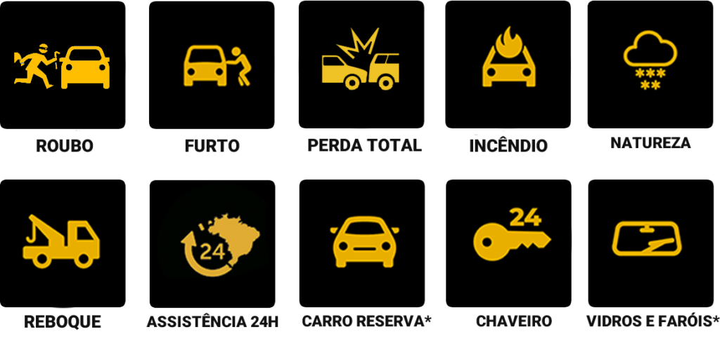 Colisão - Furto - Roubo - Fenômenos da natureza - Chaveiro - Borracheiro - Pane Seca - Pane Mecânica - Pane Elétrica - Terceiros até R$ 30.000,00 - 300 KM reboque em pane - Reboque ilimitado colisão